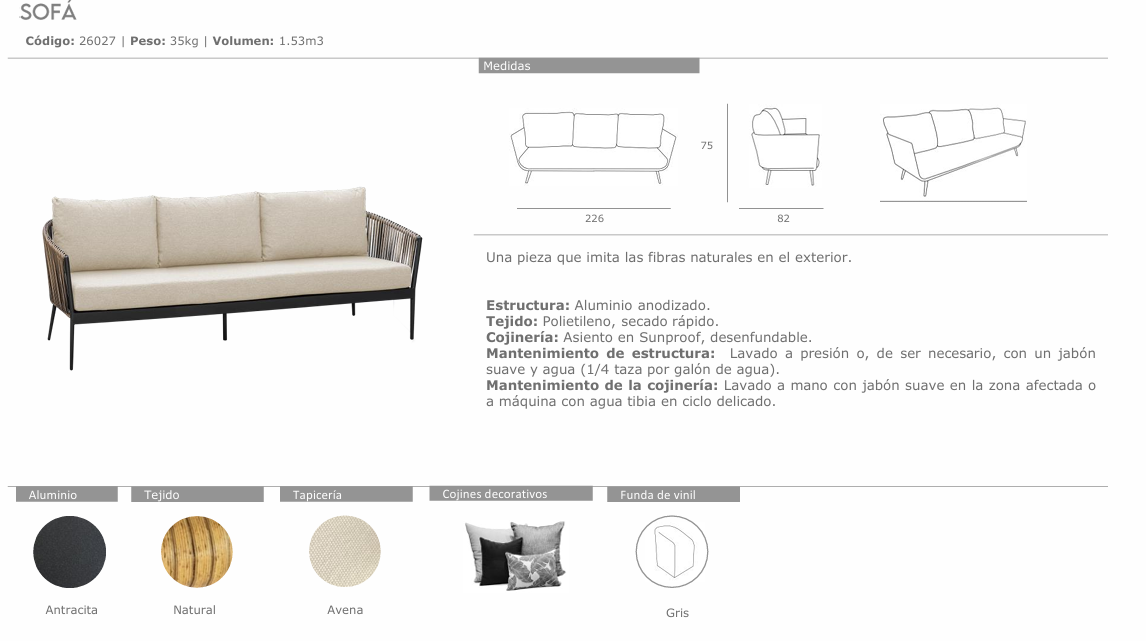 Estructura: Aluminio anodizado. Tejido: Polietileno, secado rápido. Cojinería: Asiento en Sunproof, desenfundable. Mantenimiento de estructura: Lavado a presión o, de ser necesario, con un jabón suave y agua (1/4 taza por galón de agua). Mantenimiento de la cojinería: Lavado a mano con jabón suave en la zona afectada o a máquina con agua tibia en ciclo delicado.