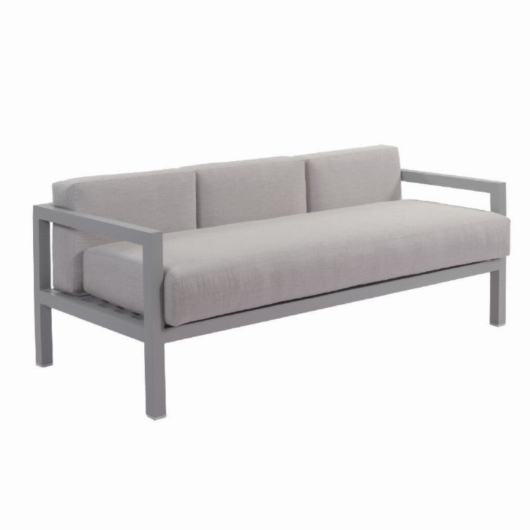 Sofá TULUM de tres plazas, es una fusión perfecta de estilo y funcionalidad contemporánea. Estructura de aluminio y tela acrílica ideal para exteriores.